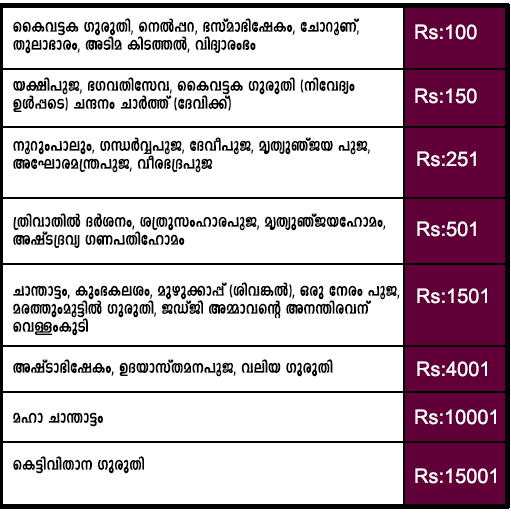 Please contact temple authority(+91 9446560765, +91 4792311263) for latest vazhpadu rates for online vazhipadu booking, send amount to the following account